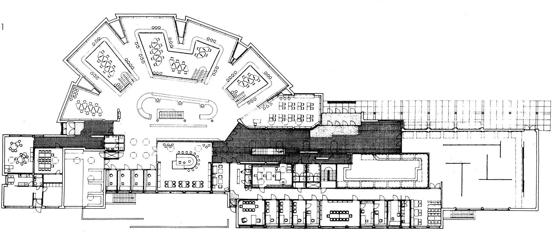 Kansaneläkelaitoksen pääkonttorin (1953–56) kirjasto[3] palvelee sekä henkilökuntaa että ulkopuolisia asiakkaita. Kirjastosiiven suljettu hahmo erottuu punatiilisestä toimisto-osasta tumman luonnonkivijulkisivunsa ansiosta. Kirjastosalia kutsutaan usein pienois-Viipuriksi, mitä se kattoikkunoineen ja kirjasyvennyksineen muistuttaa.