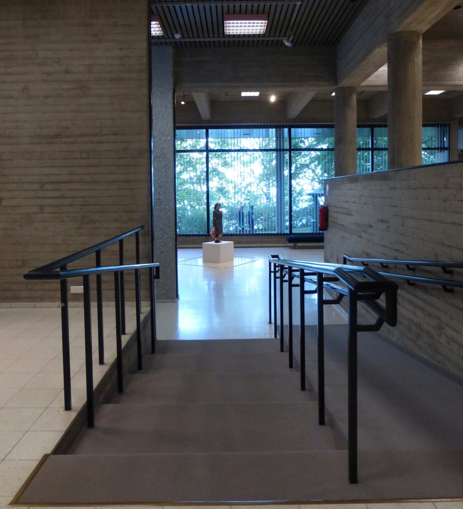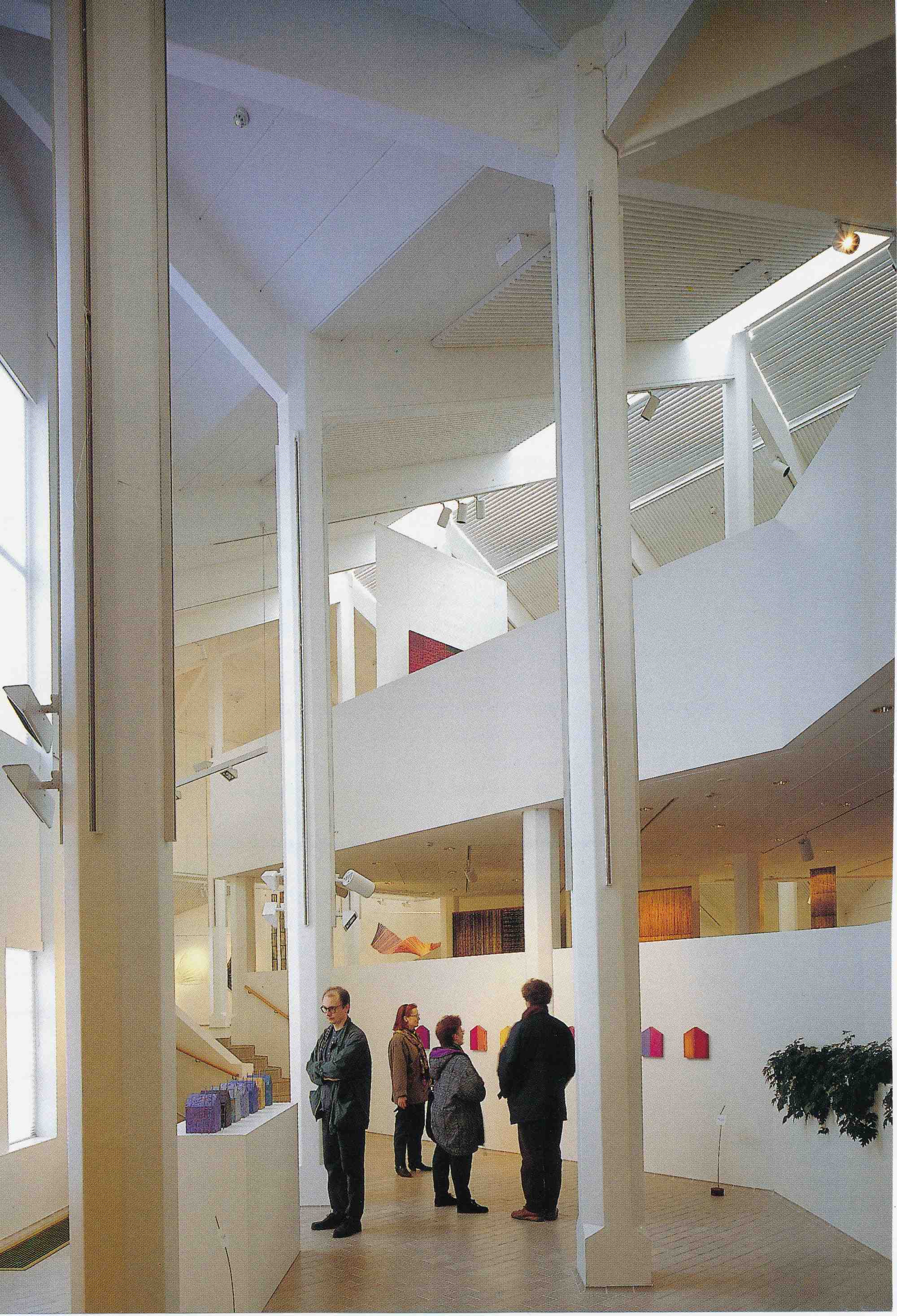 Ulkoseinät ovat vaalearouheista pesubetonia, sisällä kantavat seinät on jätetty betonivalun jälkeen käsittelemättä. Näyttelyseinät on verhottu valkeaksi maalatulla kangaspinnoitteella, ja tilojen jakamiseksi pienempiin osiin on käytössä ollut irtoseiniä. Lattiat ovat kivilaattaa. Rakennus oli valmistuessaan maan suurin taidemuseo (2 500 brm²).[38]