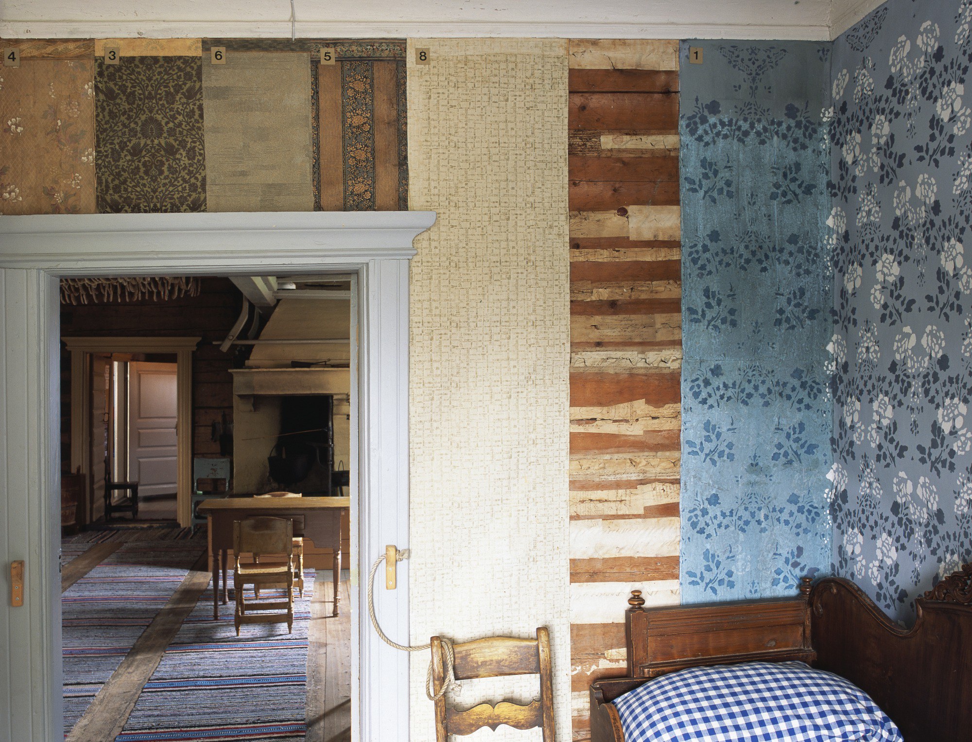 _Oik.: Yli-Lauroselan talonpoikaistila Ilmajoella avattiin eteläpohjalaista rakennustapaa esittelevänä museona 1978. Päärakennuksen (1848) kamarin hirsiseinällä on esillä huoneen tapettikerrokset eri aikakausilta. Kuva: Soile Tirilä, Museovirasto.
