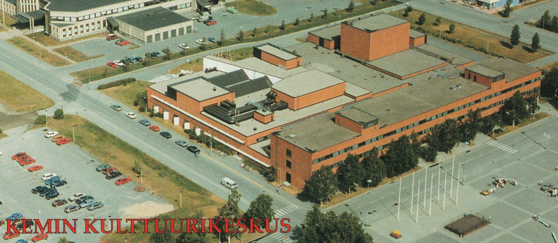 _Oik.: Kemin kulttuurikeskus: museotilat ovat keskellä, teatterin ja kirjaston välissä, ja niitä merkitsee näyttelysalin valkea seinä. Yhteinen sisäänkäynti on torin puolella. Kuva postikortista, Jukka Mononen.