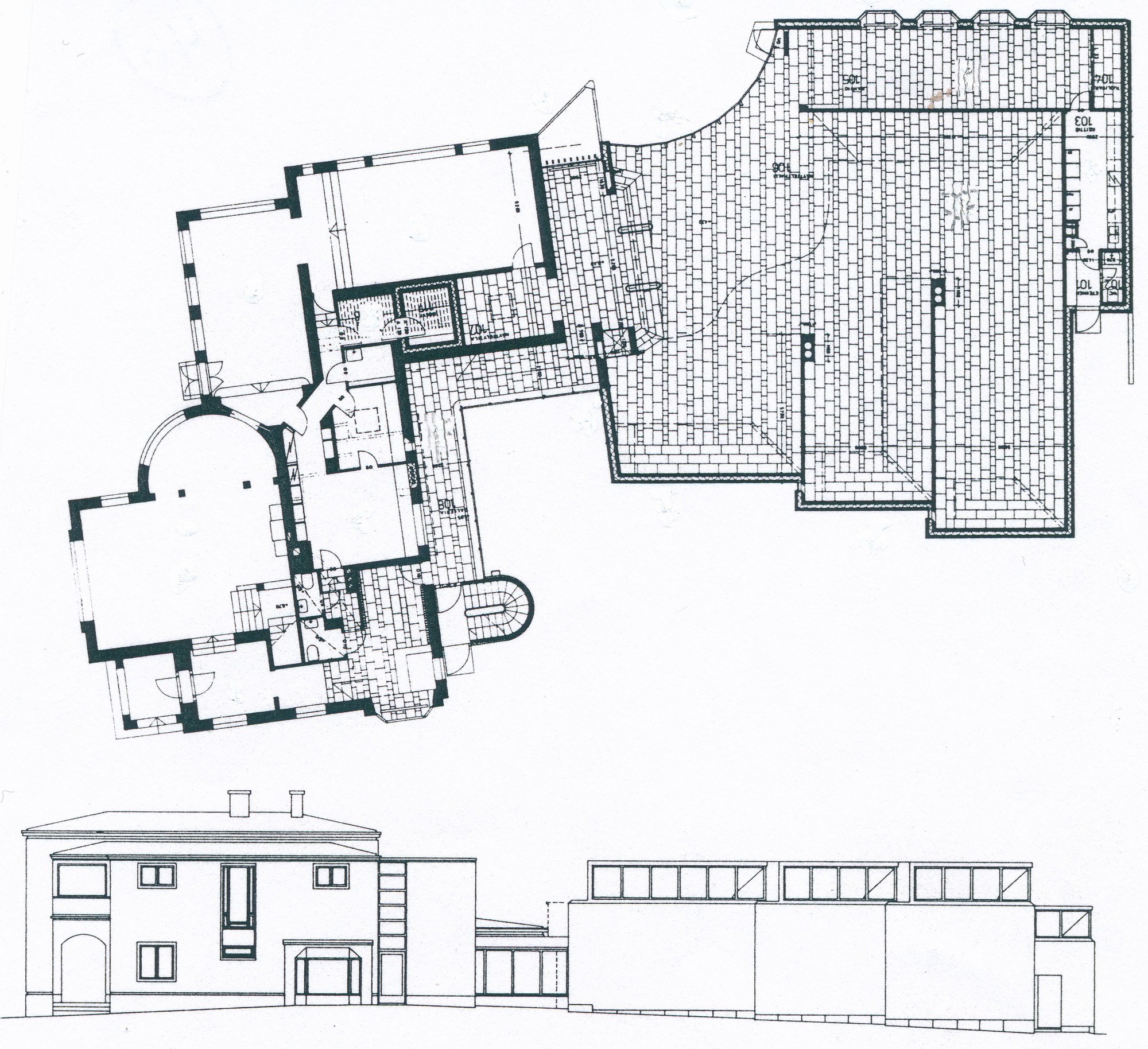 - työhuoneet ja varastot sivummalla ja kellarissa.