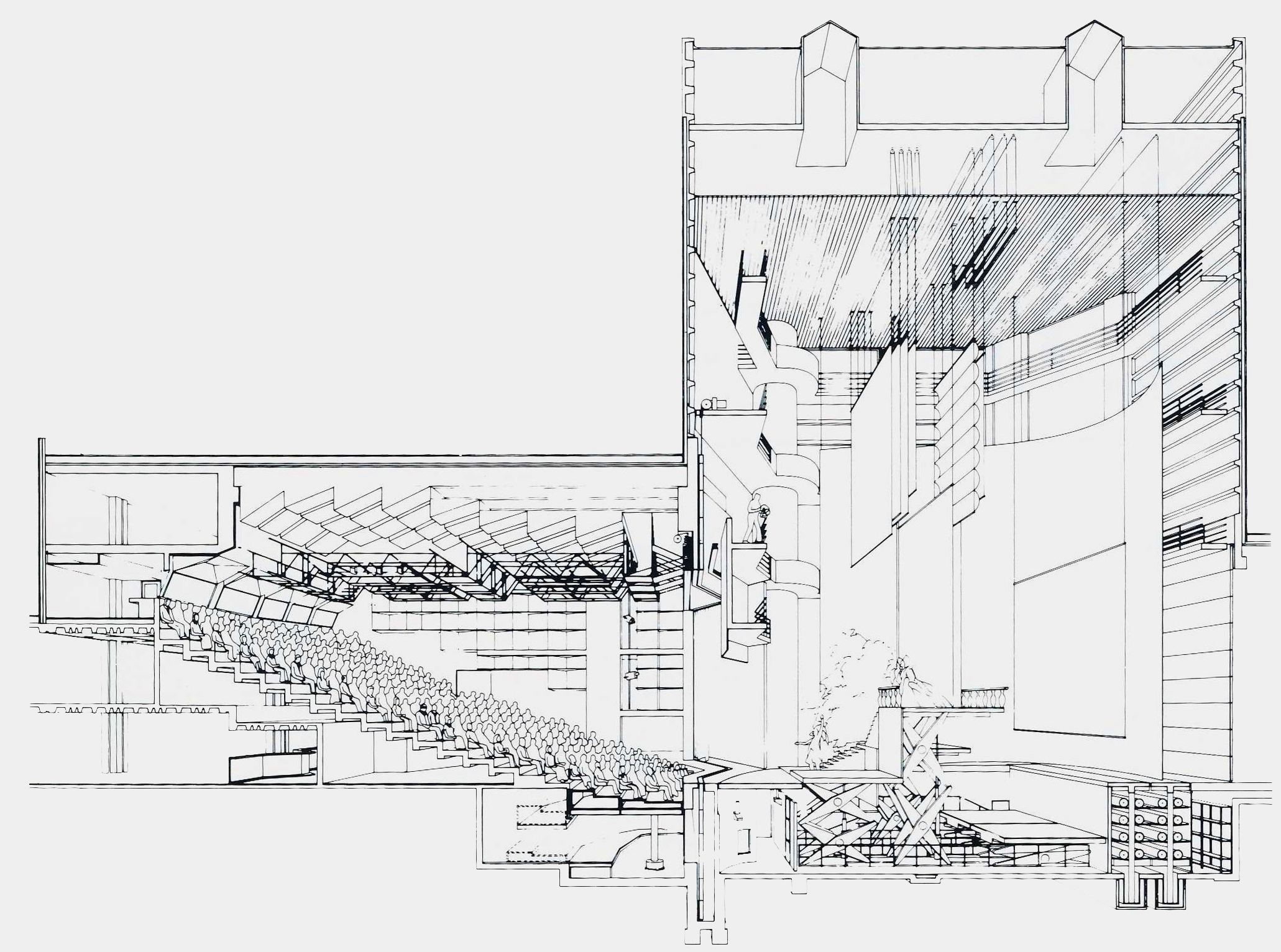 Rakennushahmossa erottuvat näyttämötorni, suuren näyttämön katsomo, kulissivarastot ja verstastilat sekä pukuhuone- ja hallintotilat.[39] Kokonaisuutta hallitsee modulaarisuus: teräsrakenteiset kimppupilarit ja ristikot sekä betonielementit. Rakenteellinen korostus jatkuu sisätiloissa alakattojen betonisina kupuina diagonaaliripoineen.[40]
