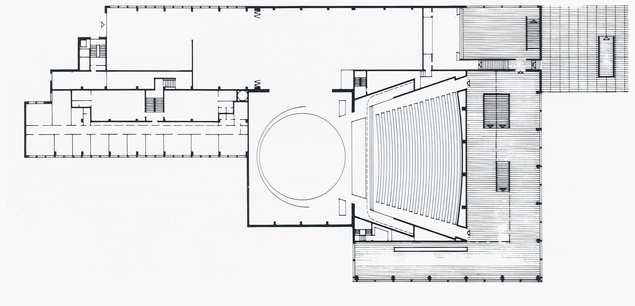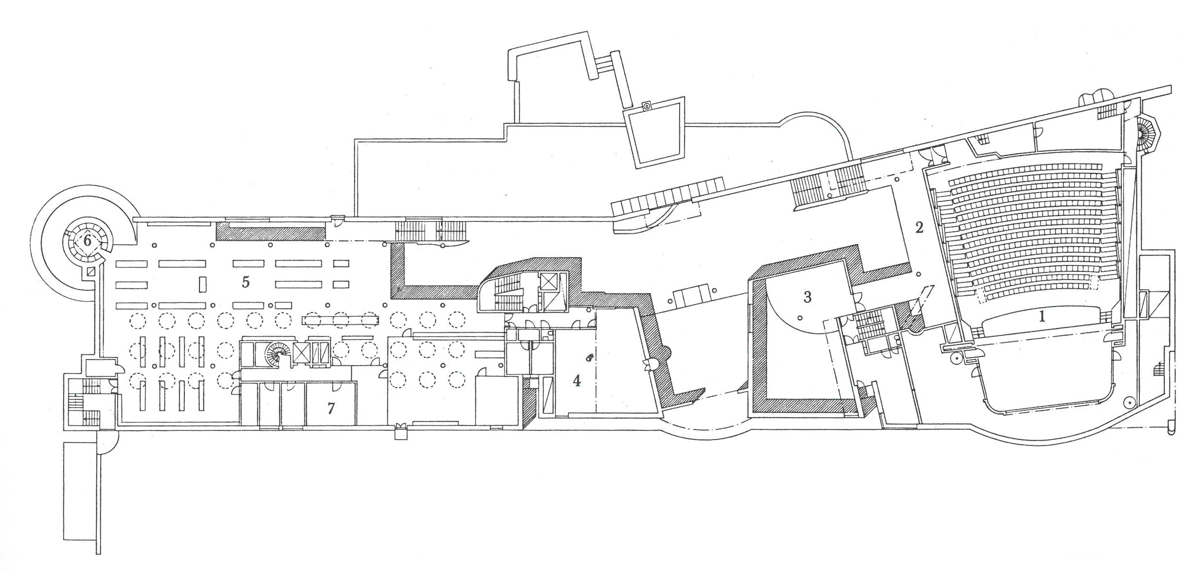 [51] Wegelius 1989, 53. Ensimmäiset teatterinsa Aalto suunnitteli Jyväskylän Työväentaloon 1924 ja Turun Maalaistentaloon 1927–28. Aalto suunnitteli kreikkalaisittain porrastettuja ulkoilmateattereita useaan kohteeseen (Tiilimäen studio, Aalborgin taidemuseo, Jyväskylän yliopisto). Toteutumattomista suunnitelmista kiinnostava oli viuhkanmuotoisen katsomon ehdotus kilpailussa Kuopion teatterista 1951. Kts. Göran Schildt: Alvar Aalto a Life´s Work. Helsinki: Otava Publishing Company, 102-103.