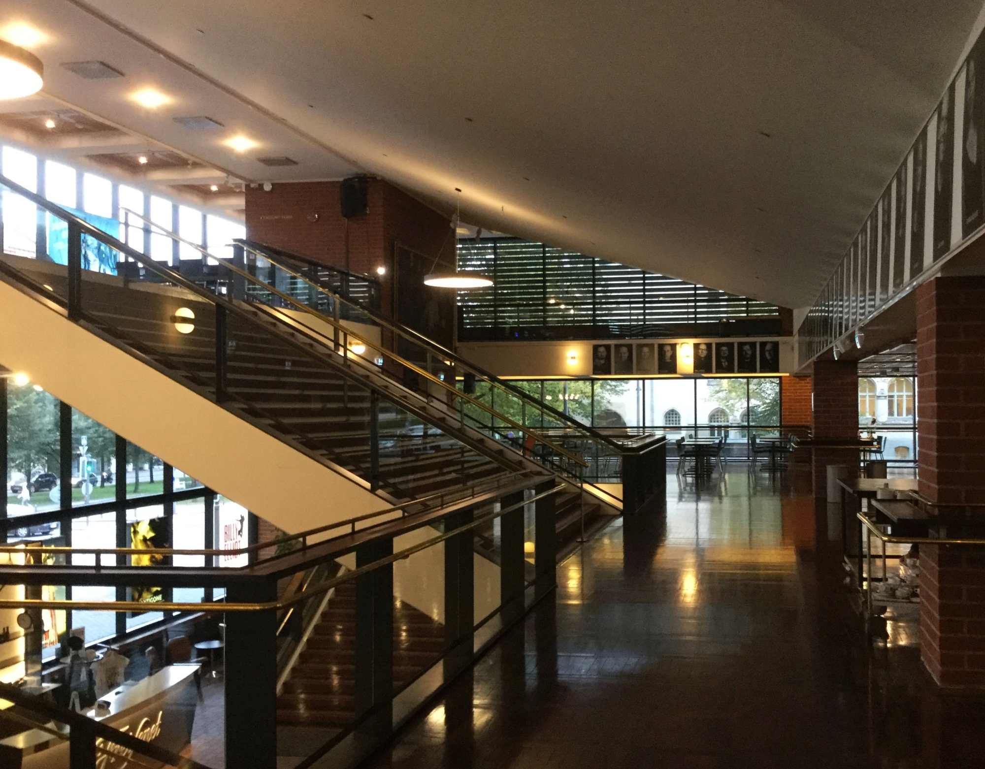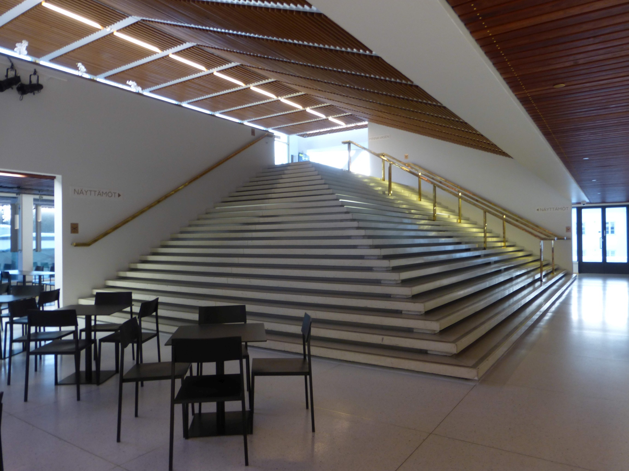 _Oik.: Monumentaalisia ”pyramidiportaita” noustaan eteistilasta lämpiön kautta teatterisaliin. Kuva: Sirkkaliisa Jetsonen 2017.
