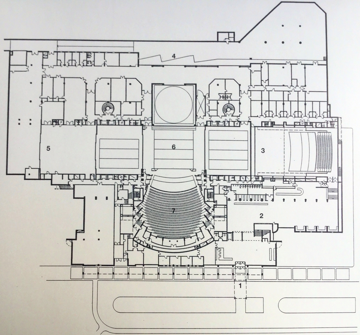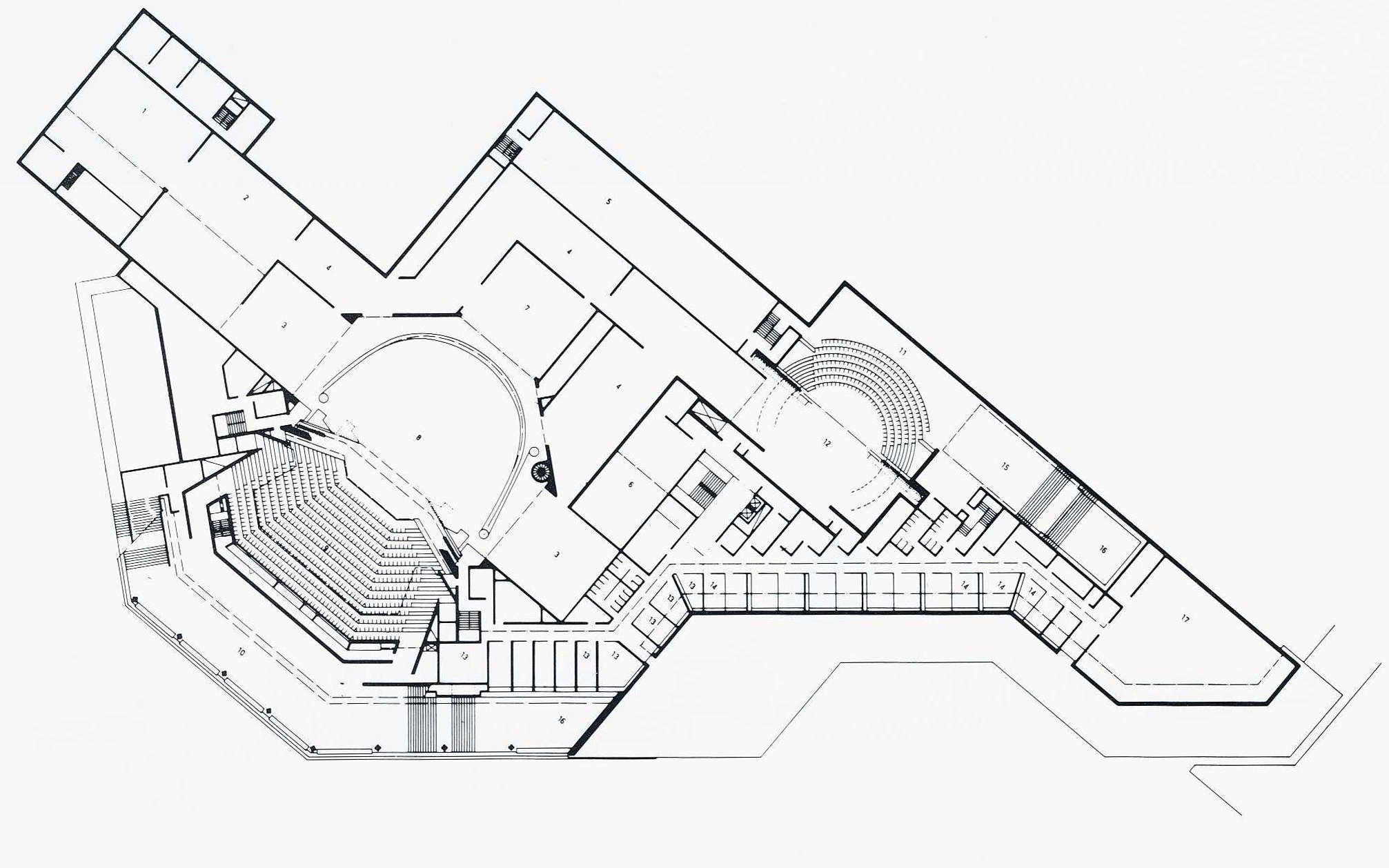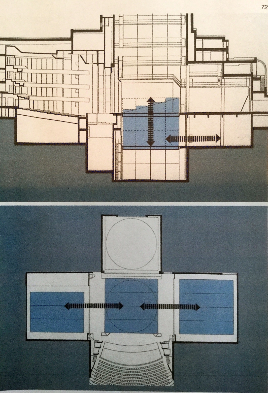 Näyttämöitä on kolme, joista kaksi suurinta samassa tasossa. Kaikki keskeiset työtilat ovat suuren ja pienen näyttämön suhteen samassa tasossa, mikä tekee niiden välisistä siirroista ja liikenteestä mutkatonta. Yleisö-, esitys- ja työtilat on eristetty toisistaan äänisuluilla, rakenteiden välisellä ilmaraolla.