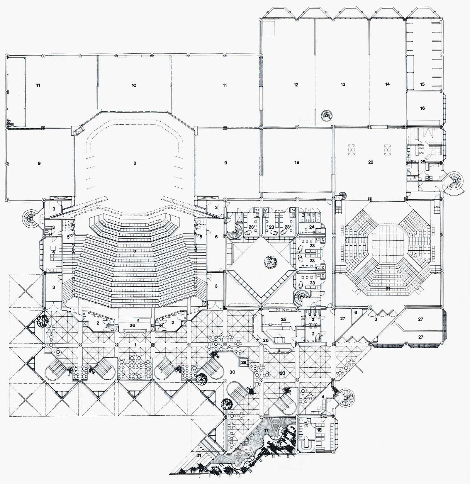 Takanäyttämöä täydensi yksi sivunäyttämö. Etunäyttämö levittäytyy katsomon sivuille. Sektorin mallisen, kohden näyttämöä kapenevan, parvellisen katsomon muotoilu viittaa barokkiteattereihin: punaiset tuolit ja esirippu, kullatut seinälistat. Kulissivarasto ja muut aputilat upotettiin osittain rinteeseen.[26]