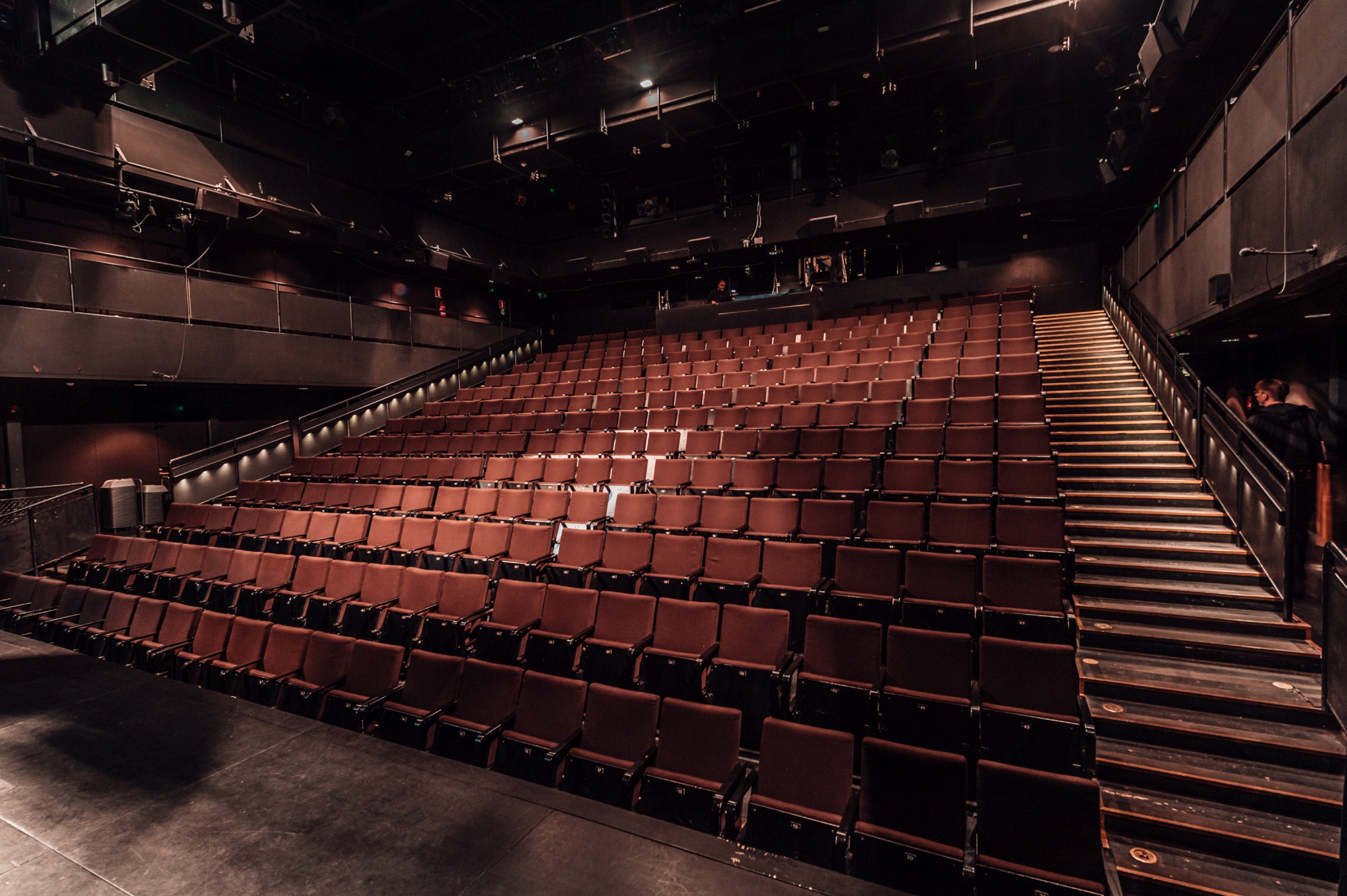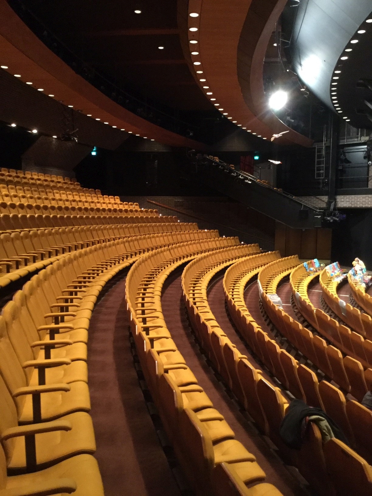 Katsomossa on 816 paikkaa. Tila ja tuolirivistöt kaartuvat, mitä tehostavat parvien alakattojen lamppurivistöt. Katsomon väritys on lämmin: seinissä tummanruskea tiili, alakatoissa tumman punertava sävy ja tuoleissa syvän keltainen verhoilu. Katsomoon liittyy kaksi sivuaitiota ja kaksi taka-aitiota.