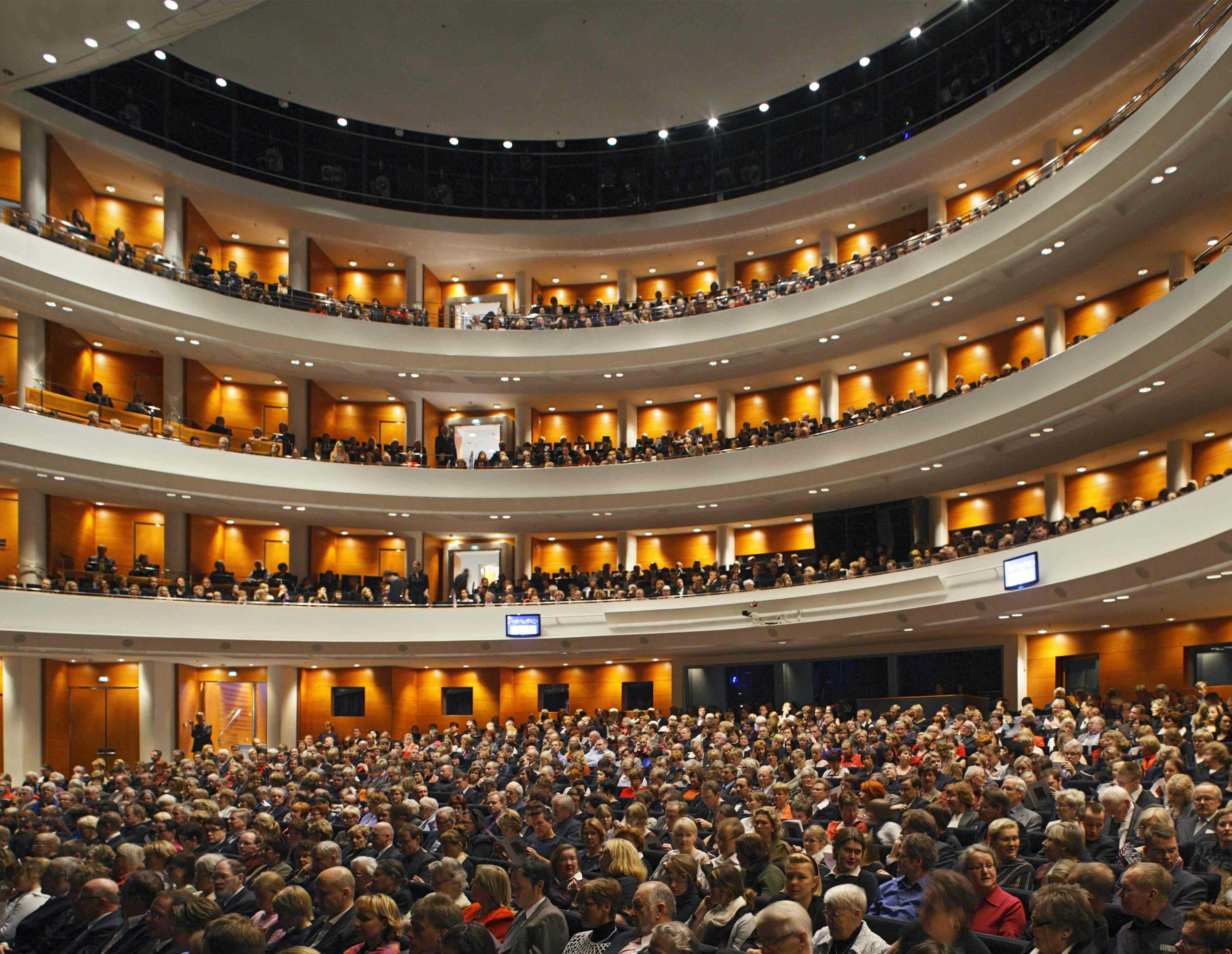 Päälämpiöön noustaan leveää portaikkoa. Vaikuttavan tilasarjan viimeistelty sisustus ja materiaalit, kuten marmori, jalopuu ja musta nahka, korostavat juhlavuutta. Suuren salin katsomo kaartuu etunäyttämön ympärille virtaviivaisin, syvän punaisin penkkirivein. Istumapaikoille tullaan sivukäytäviltä. Väljä riviväli helpottaa pääsyä istumapaikoille.[31]