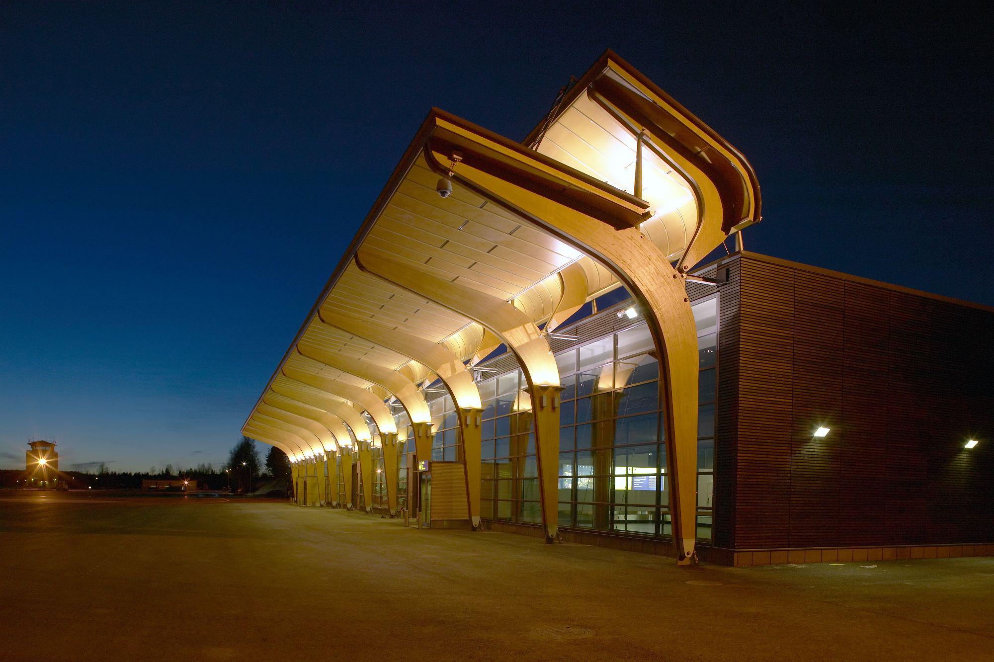 Maakuntien lentoasemat ja kattava reittiliikenneverkosto palvelevat kasvukeskuksia ja ovat keskeinen edellytys niiden elinvoimaisuudelle. Esimerkiksi jo vuodesta 1939 toimineen Jyväskylän lentokentän operaatio- ja matkustajamäärät kaksinkertaistuivat 1970-luvulla. Vuonna 1988 uusi paviljonkimainen rakennus korvasi 1960-luvun alkuperäisen terminaalin ja sitä laajennettiin Arkkitehtitoimisto Helin & Co suunnittelemalla rakennusosalla vuonna 2004. Lähtevän ja saapuvan matkustajaliikenteen tilat sijoitettiin rakennuksen vastakkaisiin päätyihin ja matkatavaran käsittelytila rakennuksen keskelle. Puinen julkisivuverhoilu sekä kenttäalueen puoleista katosta kannattelevat lennokkaat liimapuukaaret harmonisoivat teräslasirakenteista julkisivua.(41