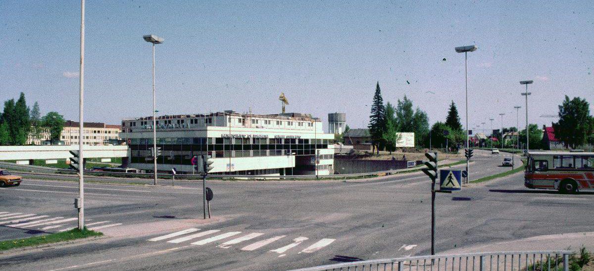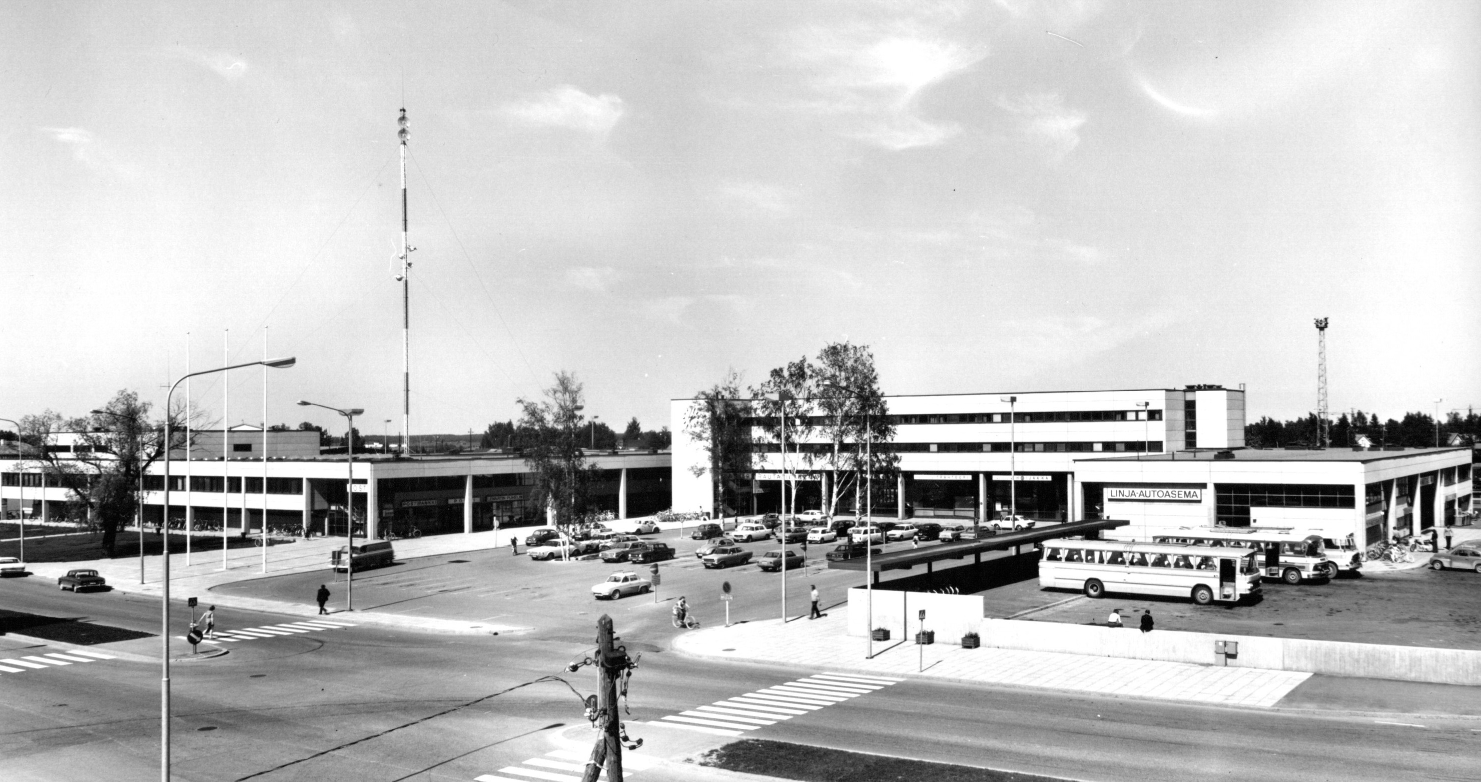 vahvasti muotoiltu räystäslinja. Lappeenrannan vuonna 1968 valmistunut linja-autoasema oli osa valtavaa, monikerroksista liikennemaisemaa. Kuva: Lappeenrannan museot / Kenzi Rinno