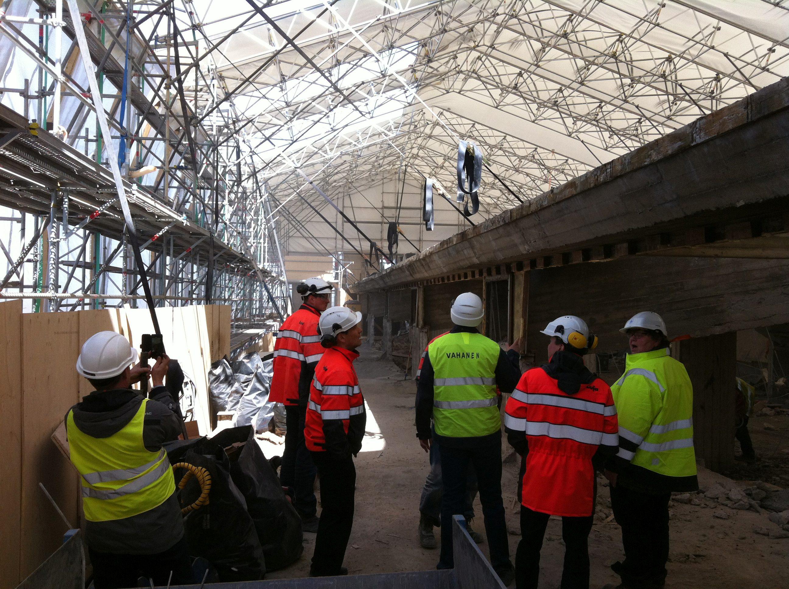 Levyverhoilun asennuksen mitoitusta tarkastetaan. Kuva: Arkkitehtitoimisto SARC Oy.