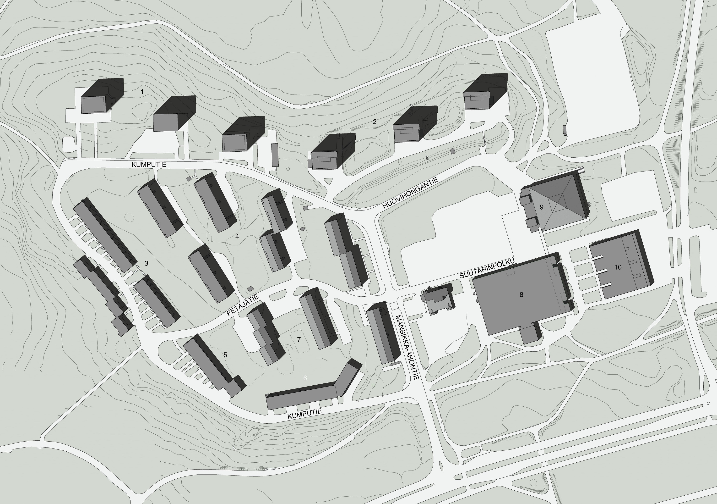 Pikku-Palomäki on Kouvolan ensimmäinen ja viimeinen metsälähiö, jossa sovellettiin avointa, maiseman piirteisiin tukeutuvaa rakennusten sijoittelua. Viitakumpu (arkkitehti Ensi R. Louhiluoto) on sekoitus vapaata luonnonmukaista suunnittelua ja tuulimyllykorttelikaavaa. Eskolanmäki (Ensi R. Louhiluoto) on uusruutukaavaa.
