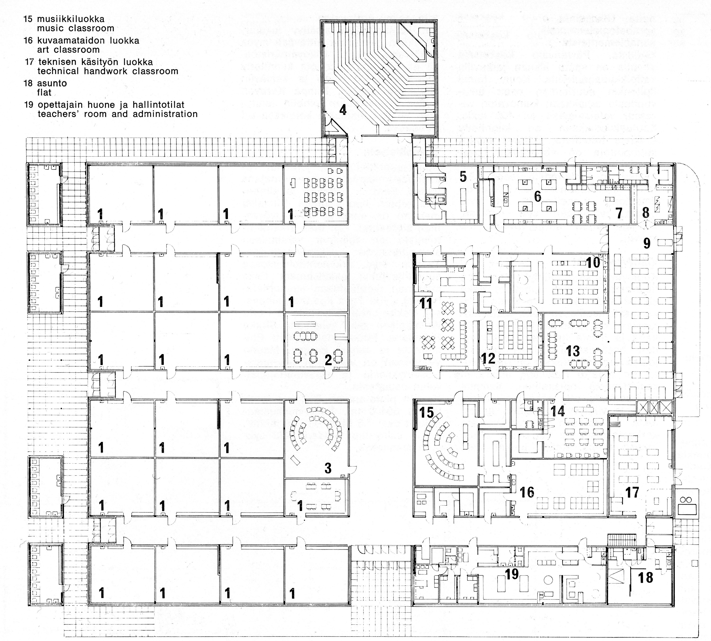 Alueen itäosassa tasamaalla on aluetta palvelevien julkisten rakennusten kolmikko. Kukin rakennus ilmentää aikakauden rakenteellisen järjestelmäajattelun innoittamaa arkkitehtuuria. Mansikka-ahon koulu ja urheiluhalli valmistuivat 1962 (arkkitehti Olavi Soukka), keskuskeittiö on vuodelta 1976 (arkkitehti Eeva Keppo). Keskuskeittiö jakautuu toimintojen mukaisesti teräsristikko- ja kivirakenteisiin osiin. Koulurakennus, joka on purettu, oli 73,6 x 54,7 m:n halli, joka perustui 10,8 x 10,8 m:n moduuliverkkoon sijoitettujen teräspilarien kannattamiin ulkopuolisiin teräsristikkoihin. Rakenne salli maksimaalisen joustavuuden sisätilojen järjestelyssä ja tiheä kattoikkunaverkosto takasi valonsaannin. Pyramidin muotoinen 1971 valmistunut liikuntahalli (arkkitehti Olavi Soukka) perustuu liimapuurunkoon, josta ulkonevat sivutilat rytmittävät julkisivua.